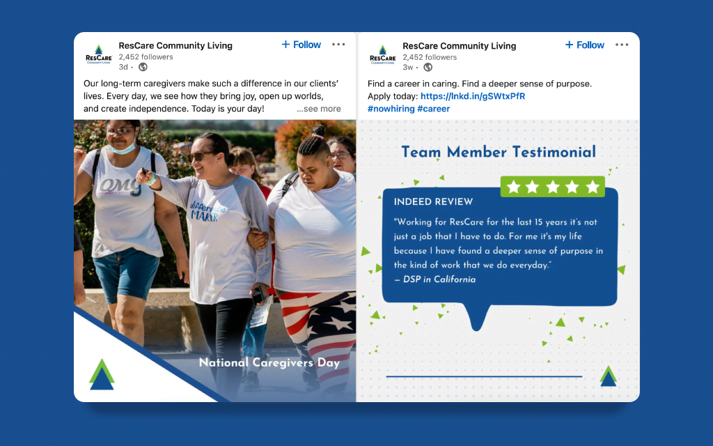 To accomplish BrightSpring’s goals, our creative team created a visual identity and set of sleek post templates for ResCare and SpringHealth’s pages — meant to instantly distinguish each brand and to match the quality of their level of care.